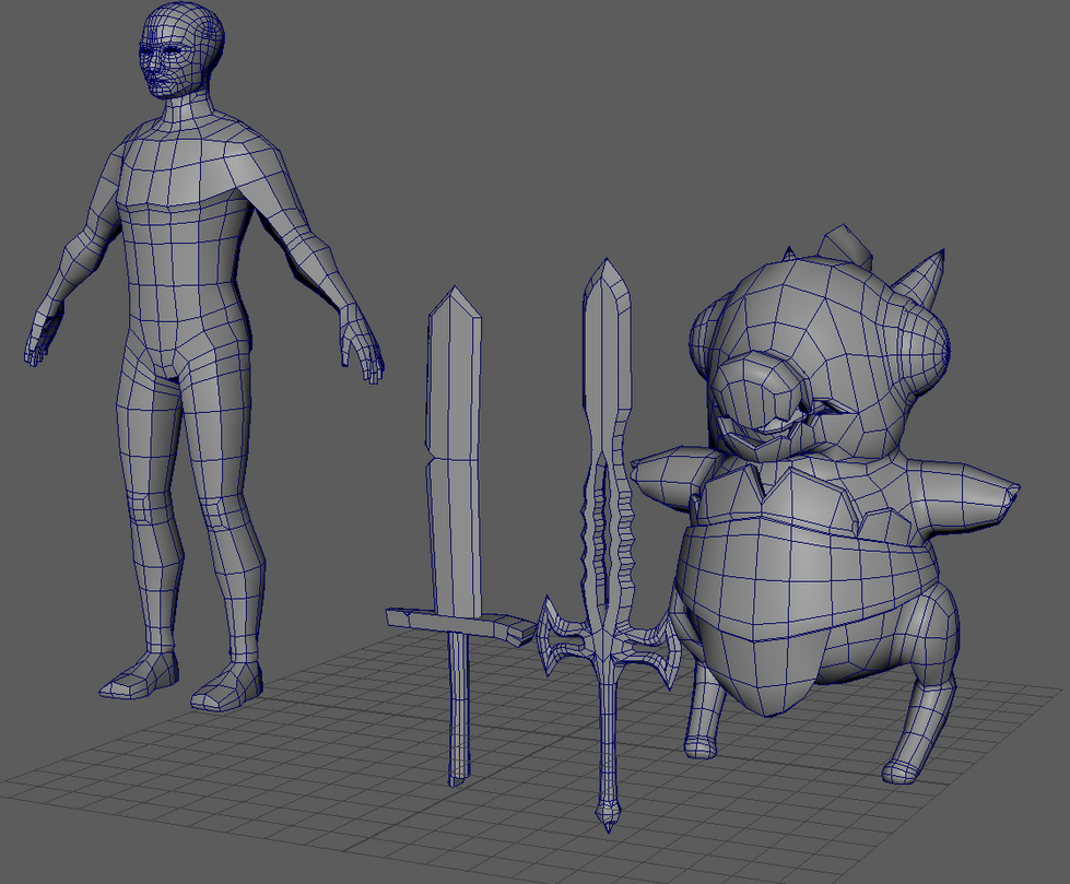 This project displays various 3D models, including a muscular creature, wireframe models of characters' faces, and small creatures. The images showcase the diversity and complexity of 3D modeling, featuring different characters and creatures in wireframe and solid forms.